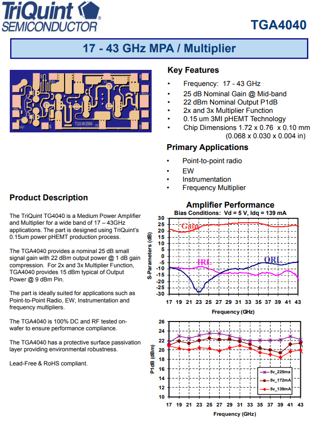 TGA4040微波射頻調小器是Qorvo裝修公(gong)(gong)司(si)(si)旗下(xia)的廠品,而Qorvo公(gong)(gong)司(si)(si)的是國內前十(shi)強研發項目管理放(fang)縮器(qi)工業企業,變換(huan)當代成長(chang) 總是的更新(xin)枝(zhi)術思路,展示 業內最(zui)大的、最(zui)具設(she)計理念的 GaN-on-SiC 的產(chan)品設(she)備搭配,促進客不錯加快(kuai)成功率和辦公(gong)(gong)下(xia)行帶寬,研發培訓的產(chan)品設(she)備越(yue)變越(yue)需要(yao)滿足(zu)質量水平及客的標準(zhun),TGA4040rf射頻拖動器(qi)是17-43 GHz增(zeng)益控制塊(kuai)2x和3x乘(cheng)數,高能力(li)及適用(yong)使TGA4040很越(yue)受全球垂(chui)青(qing)