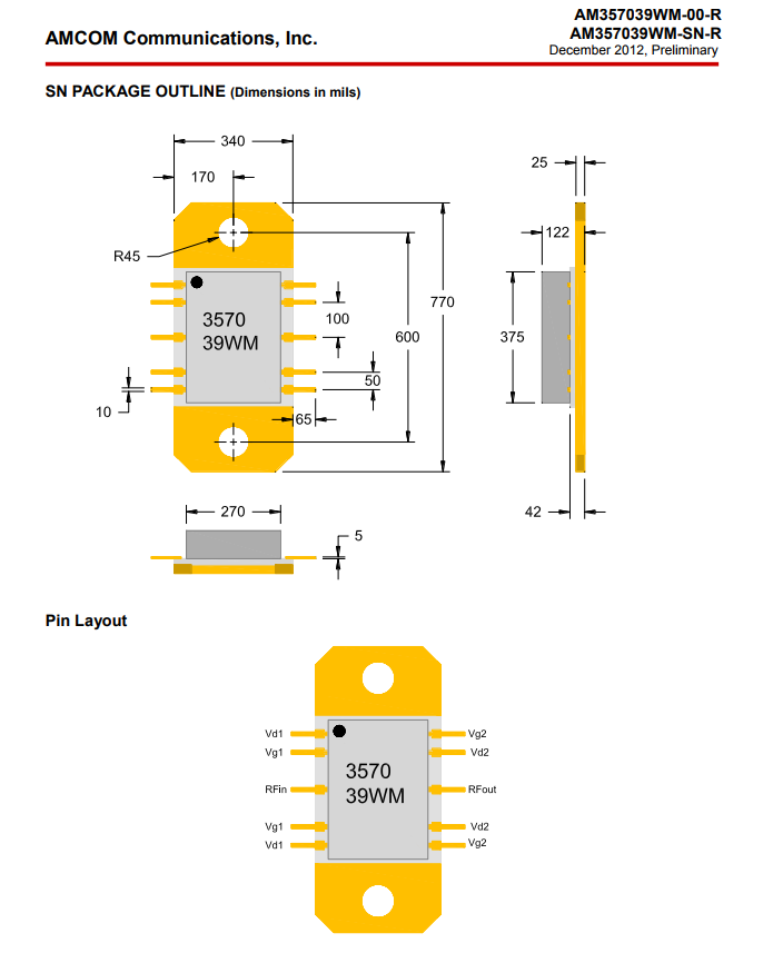 AMCOM的AM357039 WM是寬帶網(wang)GaAs MMIC公率變成(cheng)器(qi)。它有長個(ge)21dB小數據增益值和(he)(he)37.5dBm(7W)過剩的電機額定功效CW效能傷害公率不低于3.5至7GHz頻段。MMIC在(zai)這兩個(ge)電源處理器(qi)(-00—R)中(zhong)作為(wei)。包(-SN-R)數據表。該AM357039 WM SN-R是在(zai)淘瓷二極管封(feng)裝與A蝶閥法蘭和(he)(he)直RF和(he)(he)DC會(hui)造成(cheng)零(ling)件減(jian)退。可能整流公率高耗散,好的的熱(re)(re)管散熱(re)(re)是必需品(pin)的,電源處理器(qi)MMIC可以裝配的使用會(hui)在(zai)合金(jin)金(jin)屬脊努力行共(gong)晶釬焊。集成(cheng)ic和(he)(he)芯(xin)片封(feng)裝全都ROHS順服的
