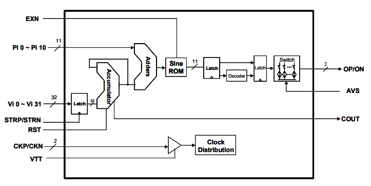 ds855是高(gao)速直(zhi)接(jie)(jie)數(shu)字頻(pin)(pin)(pin)率(lv)合成器(DDS)與一(yi)個(ge)(ge)32位(wei)頻(pin)(pin)(pin)率(lv)調諧分辨(bian)率(lv),11位(wei)相(xiang)位(wei)調制(zhi)(zhi)輸入(ru)(ru)和11位(wei)的(de)(de)幅度分辨(bian)率(lv)。第一(yi)奈奎(kui)斯特(te)帶中的(de)(de)正弦波可以產生到接(jie)(jie)近1.2 GHz(在2.5GHz時鐘(zhong)速率(lv))。初(chu)始相(xiang)位(wei)可以重置為零度的(de)(de)正弦波開(kai)始。該(gai)芯(xin)片(pian)有一(yi)對(dui)互(hu)補輸出50Ω后端。輸出波形的(de)(de)頻(pin)(pin)(pin)率(lv)可由三(san)十(shi)二個(ge)(ge)頻(pin)(pin)(pin)率(lv)控制(zhi)(zhi)位(wei)VIIO 0~VIY31控制(zhi)(zhi)。輸出波形的(de)(de)相(xiang)位(wei)可以由11位(wei)PI00~PIY10相(xiang)位(wei)調制(zhi)(zhi)輸入(ru)(ru)進行調制(zhi)(zhi)。的(de)(de)ds855接(jie)(jie)受互(hu)補時鐘(zhong)輸入(ru)(ru)或單端時鐘(zhong)輸入(ru)(ru)的(de)(de)特(te)點50?片(pian)回(hui)到終端用戶定義的(de)(de)閾值。頻(pin)(pin)(pin)率(lv)分辨(bian)率(lv)位(wei)接(jie)(jie)受TTL或CMOS輸入(ru)(ru)電平。只需要一(yi)個(ge)(ge)5V的(de)(de)電源。