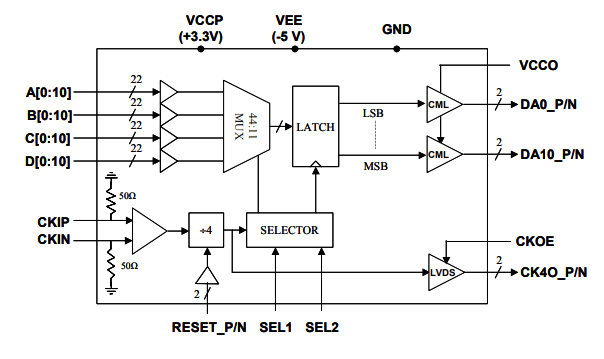 11位4:1(總44∶11)多路復用器,每個差分輸出位工作超過4 Gbps。