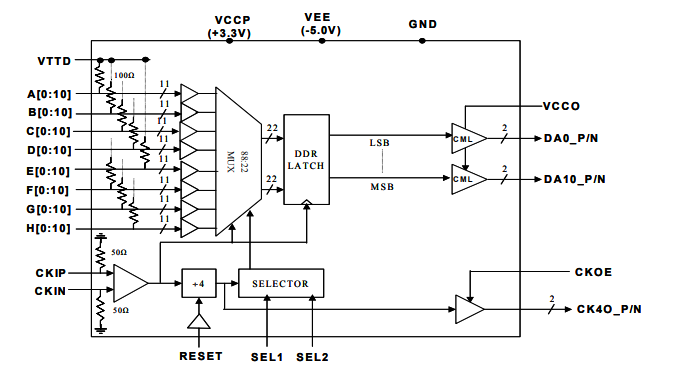 MX8811H相當于一個高速11通道的8∶1多路復用器。雙數據速率鎖存器使11位差分數據輸出的數據速率為時鐘速率的兩倍。輸出驅動器的上拉電源VCCO可用于設置適合于最流行的高速接口標準,如CML或LVDS的輸出電平。多路復用器可以以時鐘速率>4 GHz工作。數字數據輸入是單端的,其基準電壓VTTD具有片上100歐姆端接電阻,可以容忍適合各種單端接口標準的寬范圍電壓電平。控制引腳SEL1/SEL2選擇最佳采樣窗口,以適應88個輸入數據的各種延遲。提供按8分頻時鐘輸出CK8O_P/N和采樣相位選擇(SEL1和SEL2)以優化采樣相位相對于輸入數據的對準。復位功能被提供給需要同步來自多個MX88 11S芯片的輸出的應用。CKOE引腳用于啟用/禁用CK8O_P/N時鐘輸出的輸出驅動器,而不中斷內部操作,以便于系統應用。